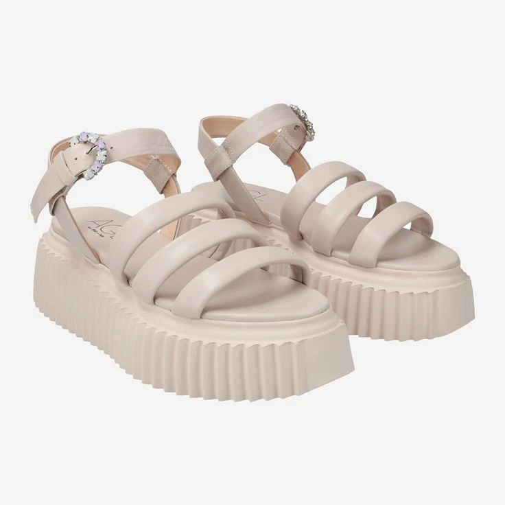 High fashion interprets AGL here quite concretely HIGH – and thus creates a whole new style! The SHINY platform sandal puts a skillful accent on the grooved sole. Soft straps made of powdery-pink smooth leather give you gentle support. The playful detail of the buckle is particularly exciting: it is decorated with colorful gemstones. AGL succeeds in an interplay of haute couture, design and styles as only Italian fashion designers can.
