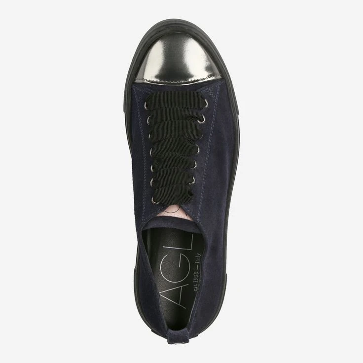 Enjoy Italian flair and sporty lifestyle! With MOLLIE by AGL, treat yourself to the perfect basic to showcase your luxurious casual style. The platform sneaker is made of soft suede and complemented by a toe cap in futuristic metallic look. Logo details underline the luxury character of this Italian designer lace-up shoe par excellence!