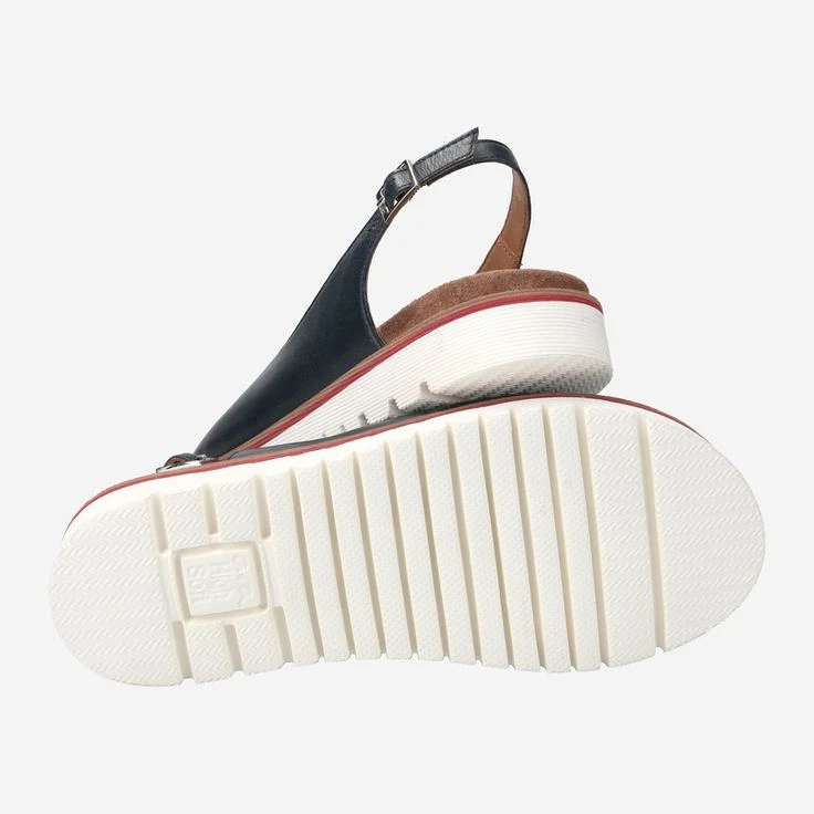- Metal closure, decorative stitching, contrast stitching, logo embossing, wedge heel