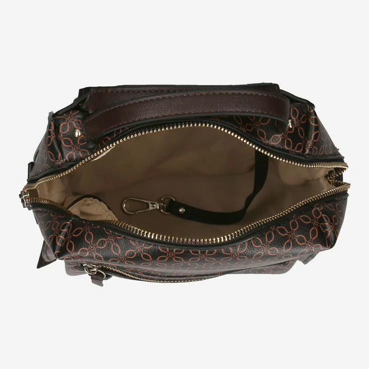 - Key carabiner, inside zipper pocket, two slip pockets, one outside pocket with zipper , handle and adjustable strap, leather application with golden ara emblem, zipper with golden stud application, h. 25 cm x w. 21 cm x d. 11 cm