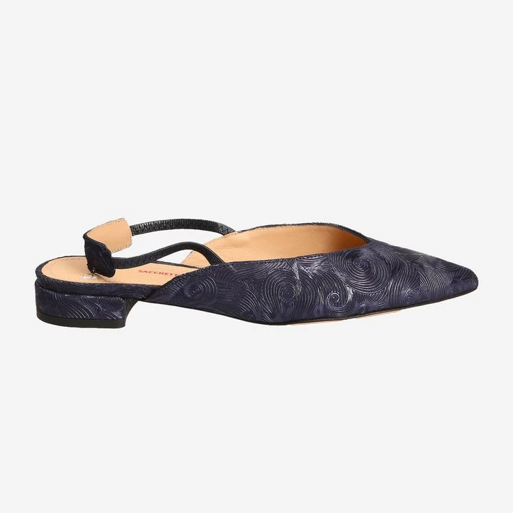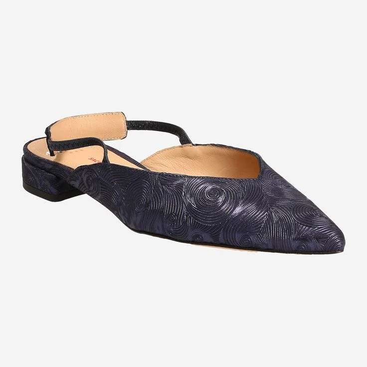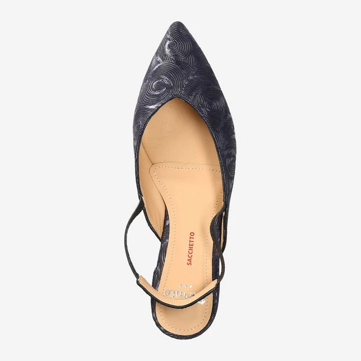 Enchantment can be excellent from this model in metallic dark blue. Perlato has created a shoe that runs in a feminine narrow cut and pointed. Thanks to the elaborate sacchetto style and the fine elastic band, your foot is enclosed like a glove. So that you are not uncomfortably warm even at higher temperatures, the heel is free except for the elastic band. Modern and elegant through the summer.
