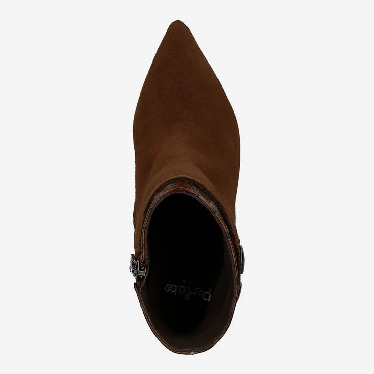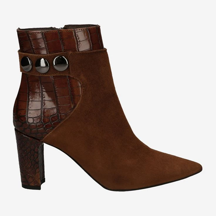 The brown suede of this chic ankle boot contrasts the stud applications on the shaft excellent. The different contrasts, such as light and dark or hard and soft given an amazingly well-functioning harmony. The whole thing is supported by the reptile leather on the shaft, which is also found on the buck heel. A zipper on the inside leg makes it easy to get in and out, and the sacchetto style lets the model nestle around your foot like a sock. Experience the best comfort with a modern look.