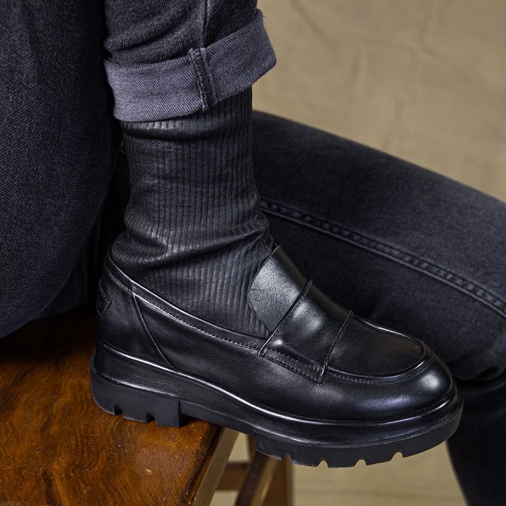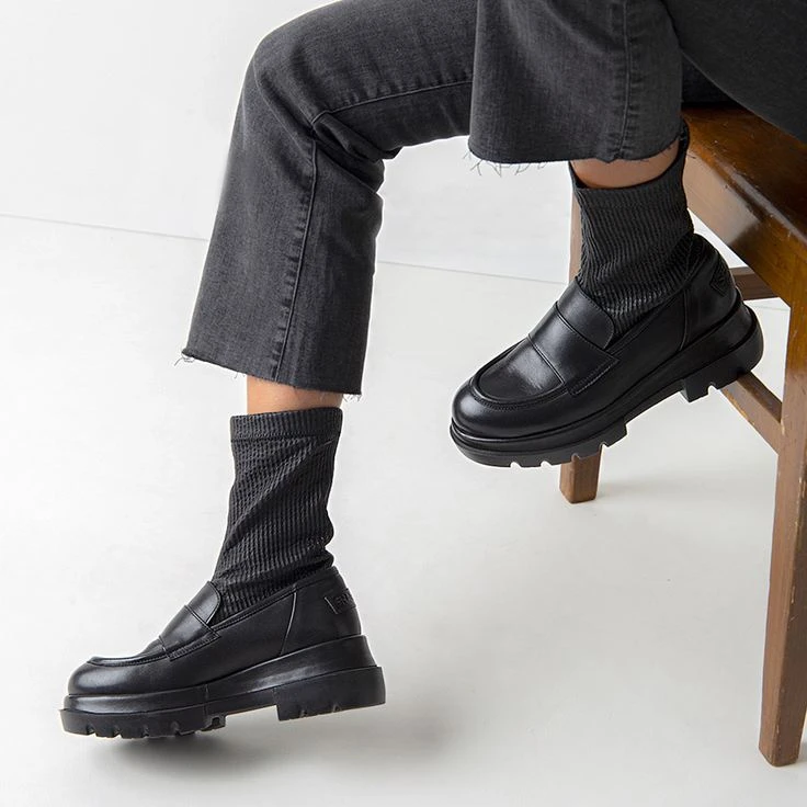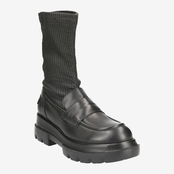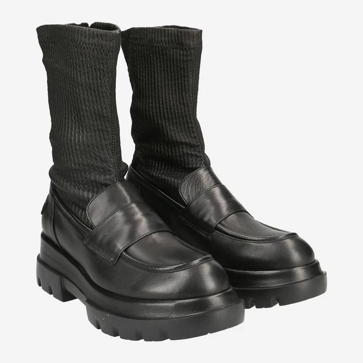 A stroke of genius has succeeded Shabbies Amsterdam with this model! This black statement boot combines the masculine charm of the penny loafers (business look) with the original sock boot (new age look), as well as an iconic biker boot! And the result: a futuristic, exciting look that is distinguished-elegant, and really casual at the same time! The black nappa leather is precisely processed, and emphasizes through the stretchy shaft area your chocolate side in the finest way! Ladies – this is exactly how fashion works!