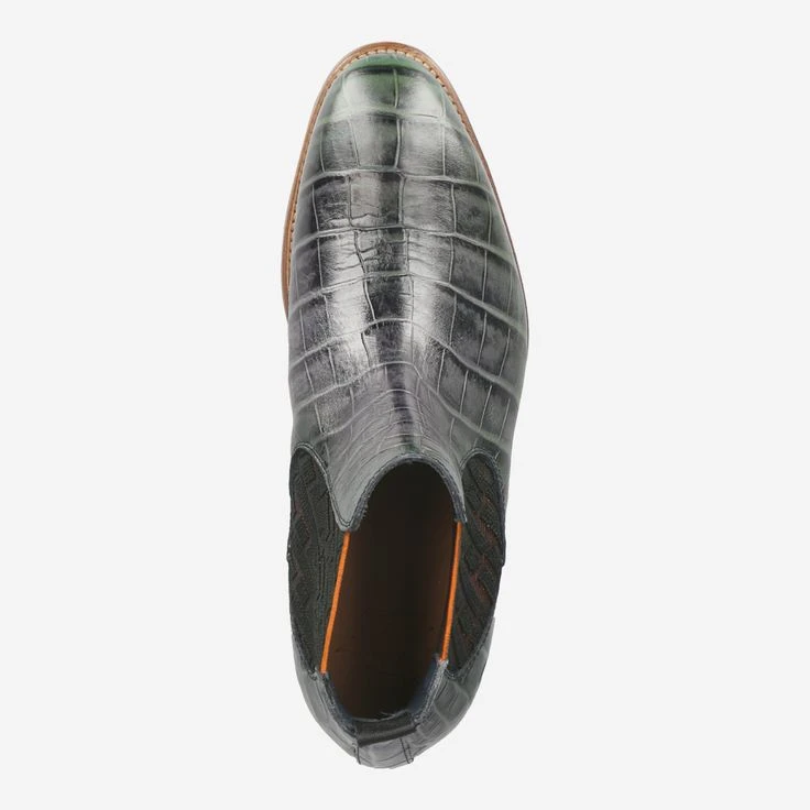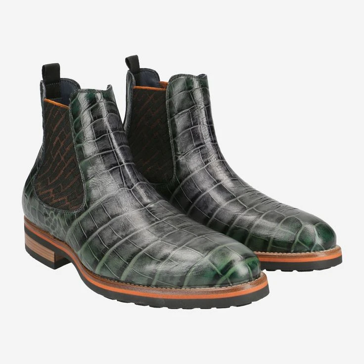 Here exciting animal style meets urban business look! The Italian manufacturer Lorenzi is known for its extraordinary designs. In masterful precision it manufactures this unique Chelsea boot. Here, the green smooth leather dominates through the embossed structure. The stitched-through sole is accented over a bright orange contrast trim. Enjoy your glamorous appearance with it!