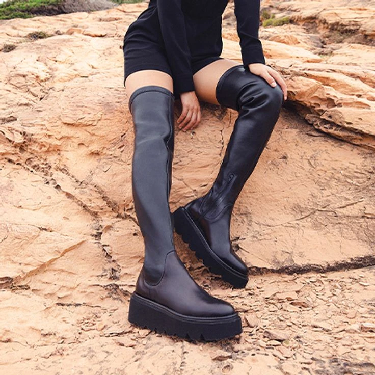 - Overknee boots, stretch leather shaft area, zipper closure, wavy platform sole