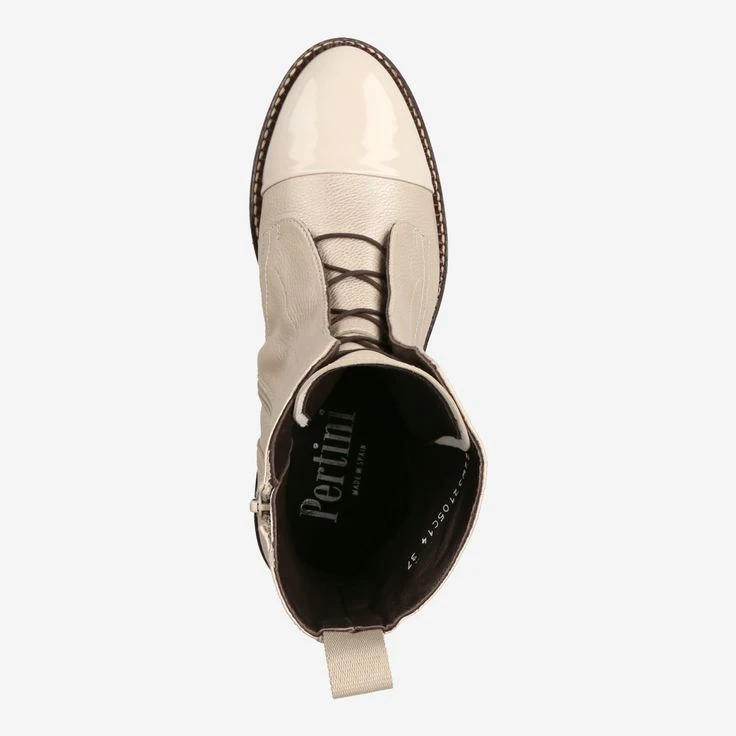 Sophistication and extravagance characterize the look of this noble lace-up ankle boot. Finest metallized leather meets a toe cap of beige patent leather. The lacing runs along the inside of the lacing strip, and picks up the contrast with the dark sole. Precisely handcrafted by Spanish manufacturer Pertini, this is the cream of the new collection. Combine it with a dress, jeans or even festive!
