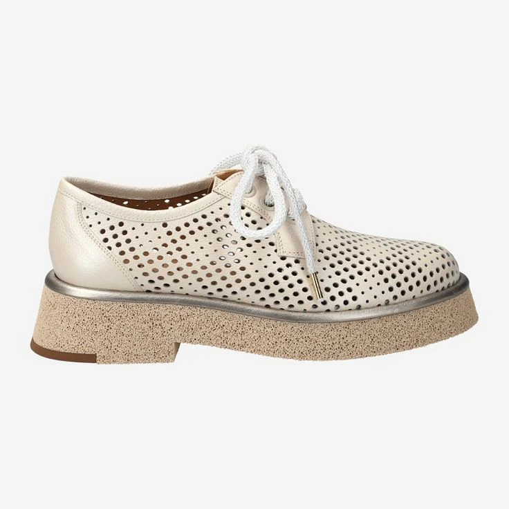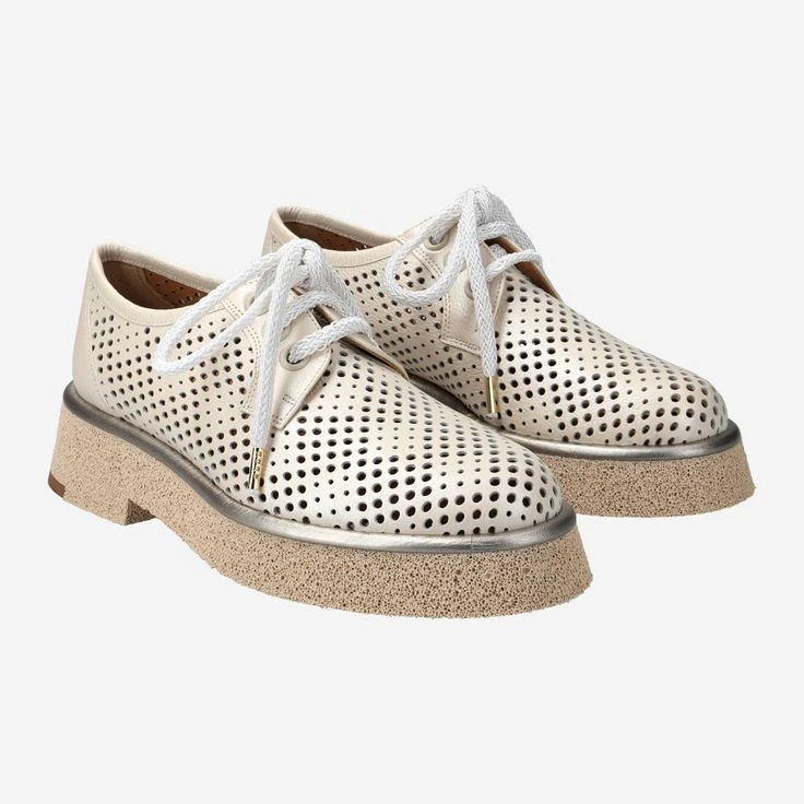 - Platform sole, decorative stitching, decorative perforation, breathable, decorative laces with gold-colored lace