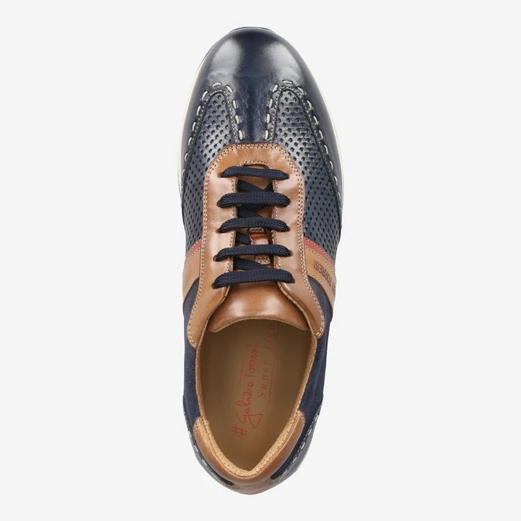 With this exclusive business sneaker made of exclusive smooth leather, you treat yourself to an ideal overall package. The Italian manufacturer Galizo Torresi takes up the design of the popular sneaker and refines it with noble components. Blue smooth leather meets perforated textured leather, bright contrast stitching, high-quality logo embossing and cognac-colored elements. The white sole rounds off the innovative look in a trend-conscious way. Everything simply fits here!