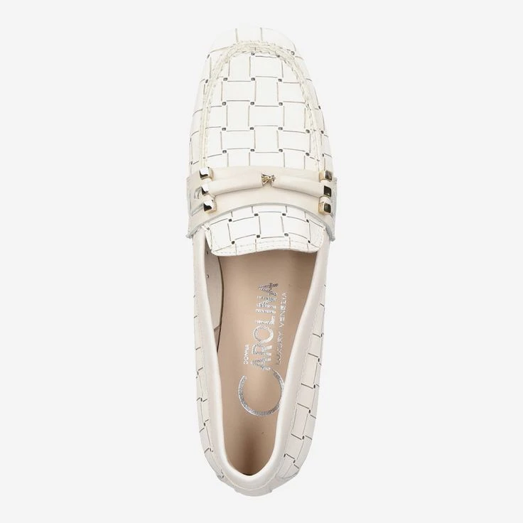 This Italian loafer from Donna Carolina combines elegance and playful ease! Because the interesting perforation of the butter-soft, white smooth leather is uniquely staged by the structured embossing! The loafer application designed with gold-colored jewelry defines the LUXURY FACTOR in this loafer. Let’s be honest: In this shoe woman simply MUST fall in love!