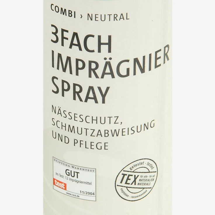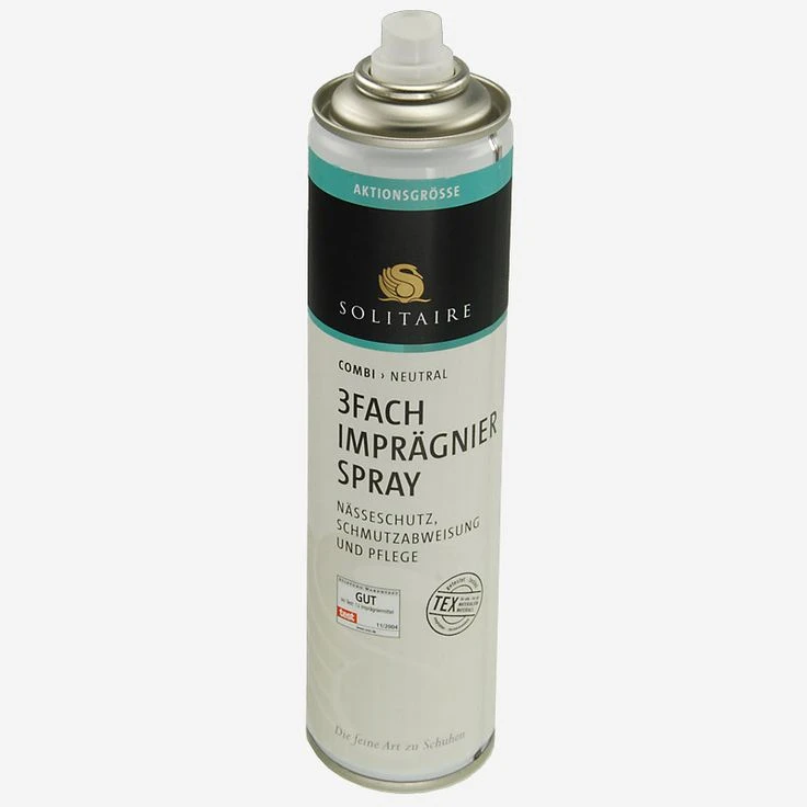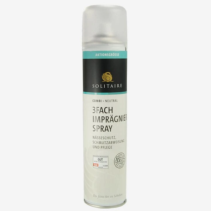 Waterproofing spray from Solitaire. 400 ml action size! Wetness protection, dirt repellency, care for all materials as well as clothing. Suitable for all “Tex” materials (e.g. Gore-Tex®). Not suitable for patent leather and Sretch materials. Application instructions: Free the shoe or clothing from dust and dirt. Please check the material compatibility. Spray from a distance of about 30 cm but do not allow the material to become soaked. If desired, the leather can be polished or re-brushed when dry.