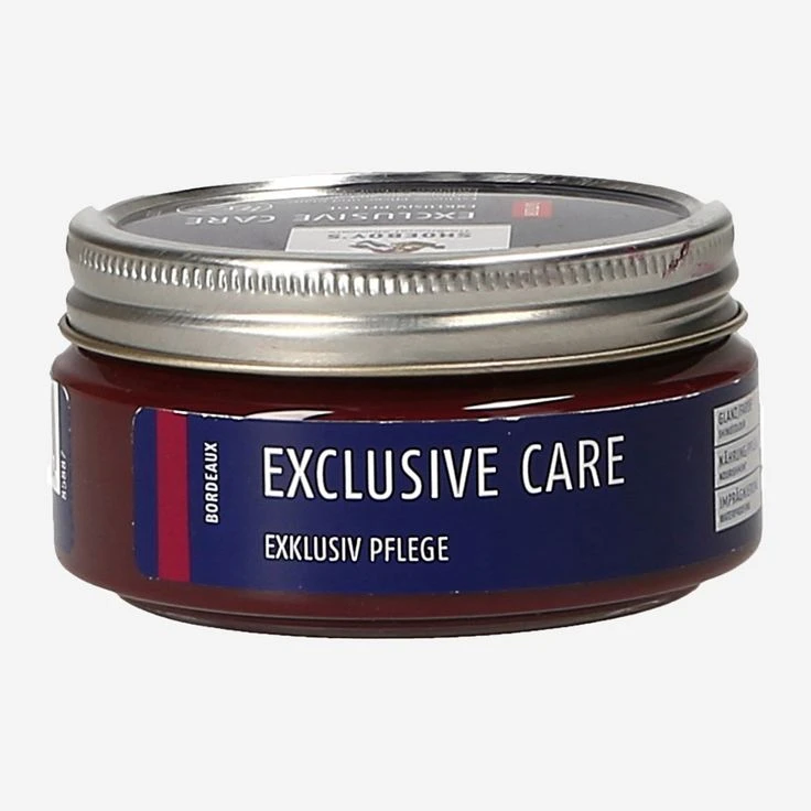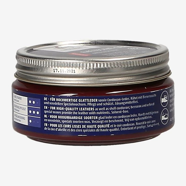 Noble brown shoe care for high-quality and delicate smooth leather and cordovan leather shoes. Intensively nourishes and cares for the leather with beeswax and refined special wax. Impregnates and preserves breathability. The light, gel-like formula is solvent-free and has a pleasant fragrance. Contents: 100 ml. Directions for use: First remove dirt and dust, then apply cream and polish with gentle pressure.