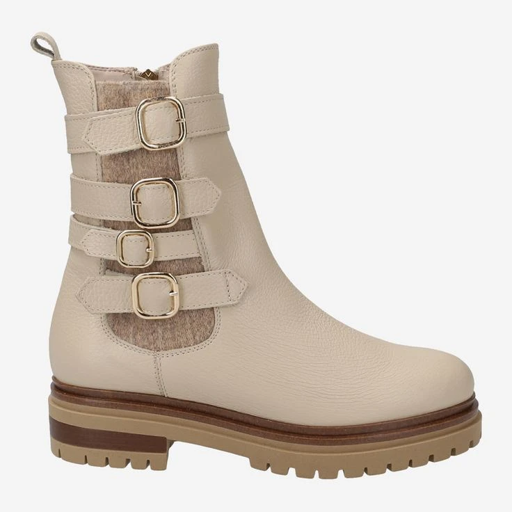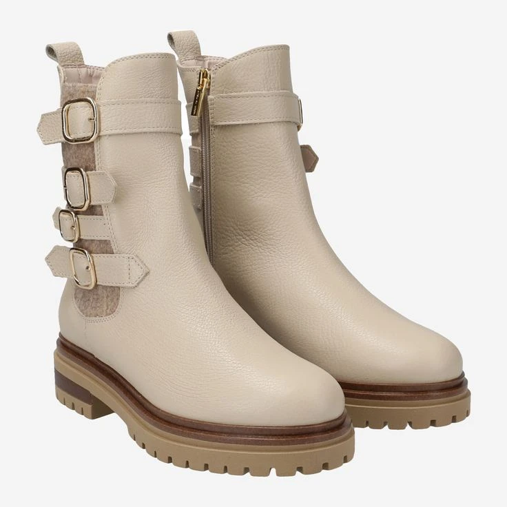With “Agata” from Schuhe Lüke you enjoy exciting style! Statement boots in bright, powdery shades are currently the highlight of the fashion world! With this cream piece you enjoy dreamy beige, natural grained leather and a stretch insert in fluffy wool look. Four decorative buckles this as an eye-catcher, which create a particularly noble look through the gold-colored metal elements.