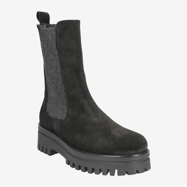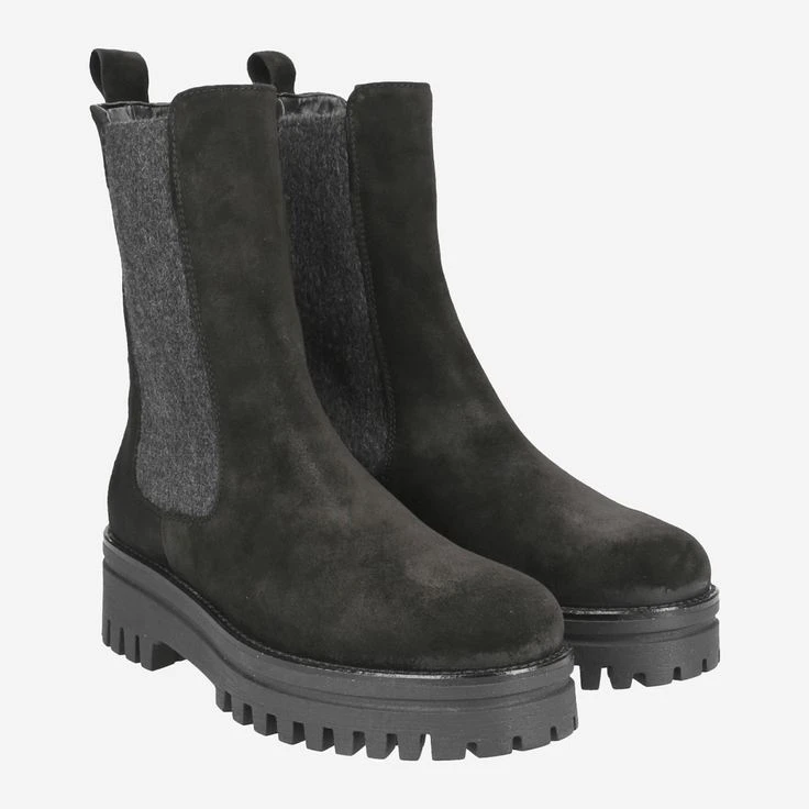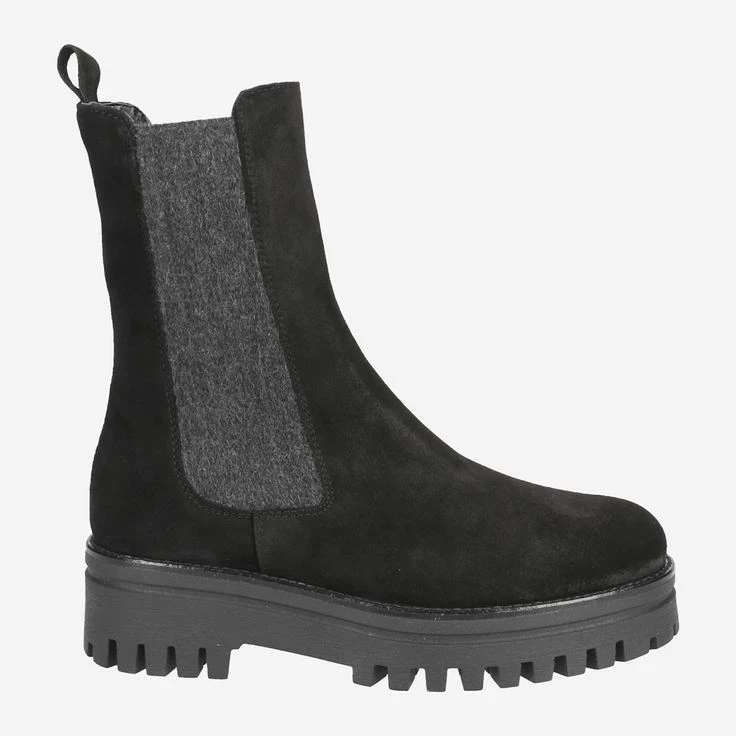 With “Amy” from Schuhe Lüke you enjoy the ultimate fashion all-rounder for your fall and winter look! The design is based on the popular Chelsea boot, which is really comfortable to wear thanks to the typical stretch inserts on both sides. The black suede leather you can combine versatile. This stylish boot is rounded off by a rocking platform sole with block heel. The grippy profile of the sole gives you optimal grip, also ideal in wet weather!