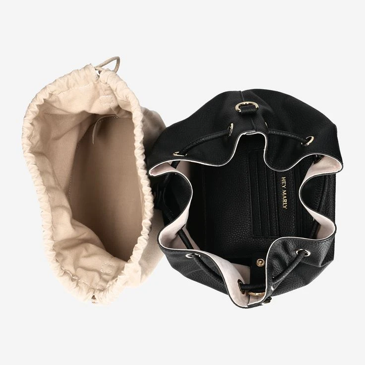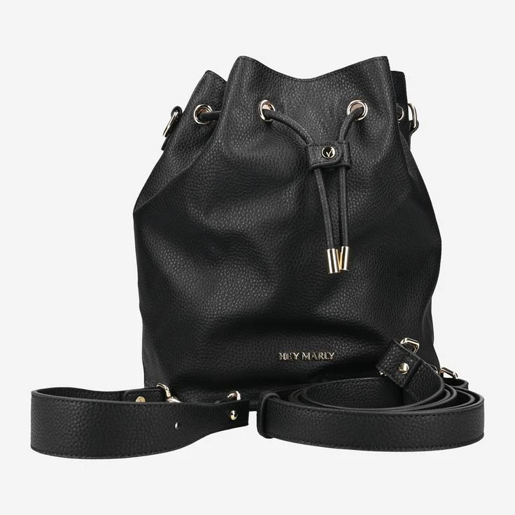 - Multifunctionality with 5 carrying options,gold-colored HEY MARLY lettering (application), drawstring with metal ends, metal eyelets, inner lining with drawstring pouch made of textile (detachable by snap fasteners on both sides), inner pocket with zipper, including 2 classic carrying straps: 1x short 44 cm, 1x long 112 to 200 cm. Dimensions (L x W x H): 22 x 16 x 27 cm