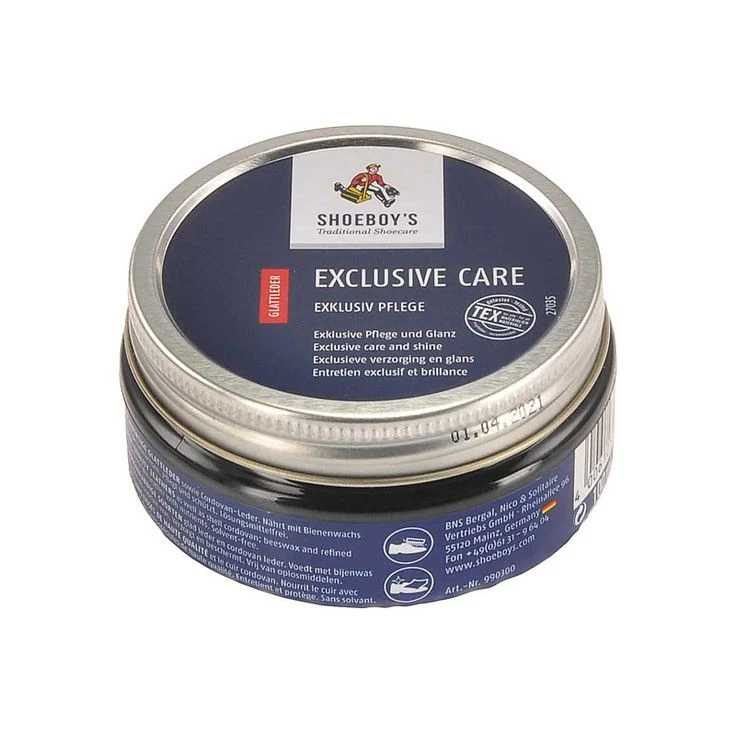 Noble black shoe care for high-quality and delicate smooth leather. Intensively nourishes and cares for the leather with beeswax. Impregnates and preserves breathability. The light, gel-like formula is solvent-free and has a pleasant fragrance. Contents: 100 ml. Directions for use: First remove dirt and dust, then apply cream and polish with gentle pressure.