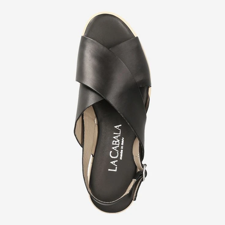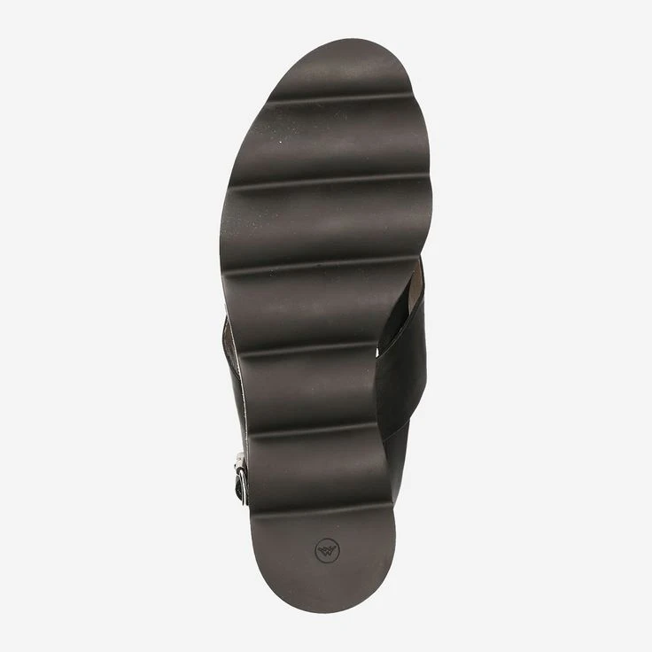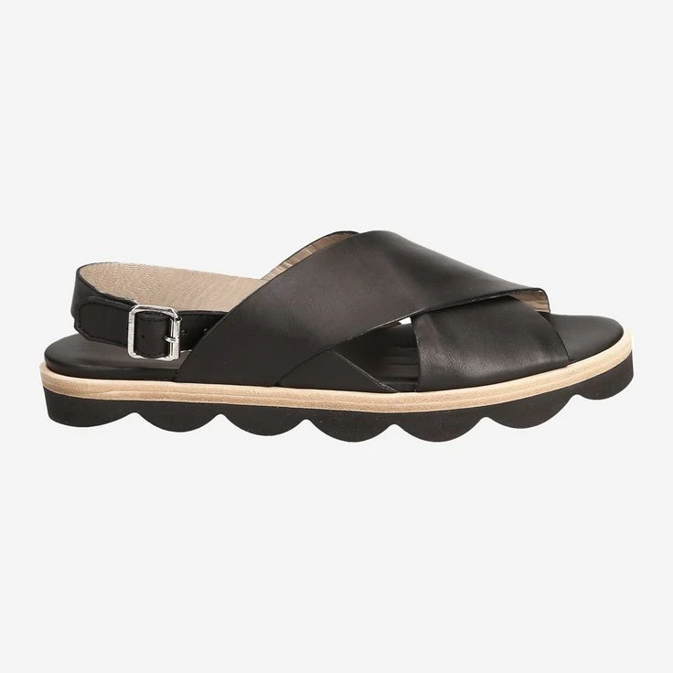 This black, simple La Cabala sandal is limited to the bare necessities. The leather strap on the heel guarantees optimal support in combination with the crossed double strap on the back of the foot. The corrugated sole offers a visual highlight, but does not stand out from the overall picture thanks to also black color.