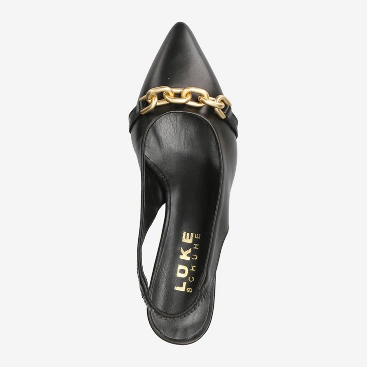 - Queenie heel, Gold-tone chain metal applique, Stretch insert, Logo embossing