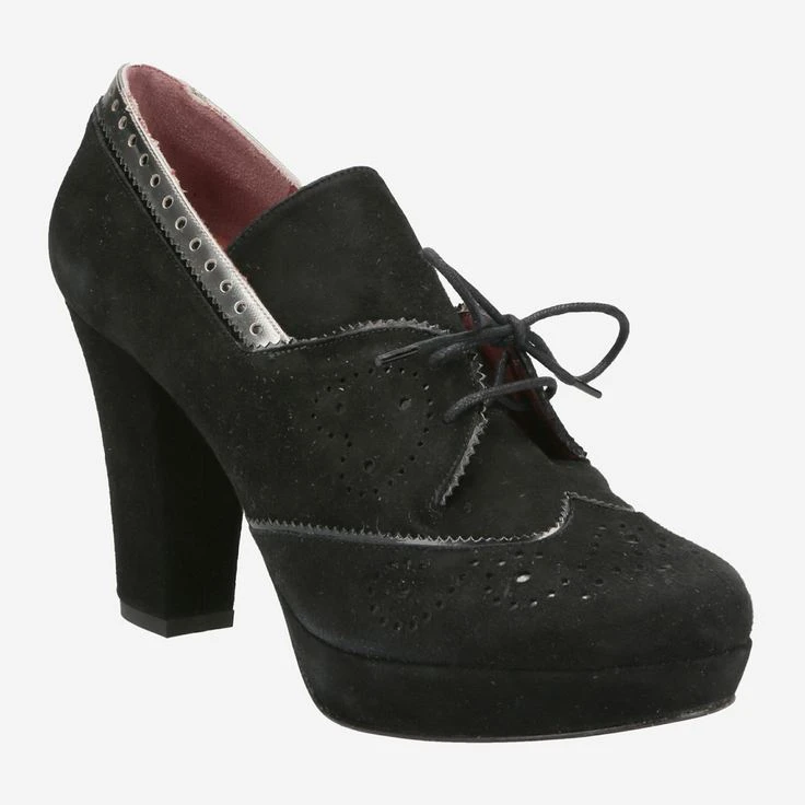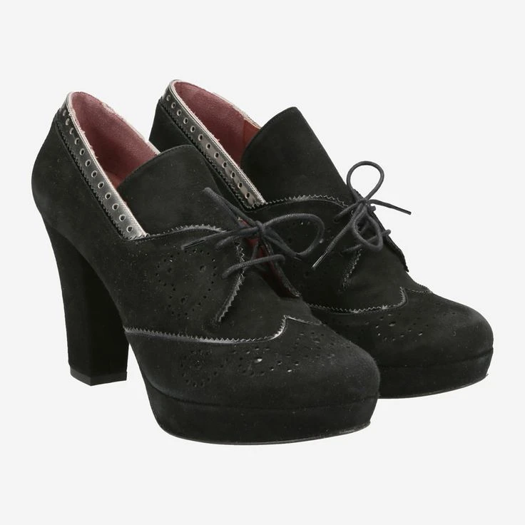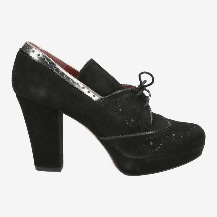 Black women’s pumps from Paco Gil. The upper is made of suede, the lining is lined with leather. The pumps have a leather insole and a high-quality leather sole. The heel is about 90mm high, the platform is about 20mm, both are leather covered. The lyra perforation and decorative stitching are also incorporated.
