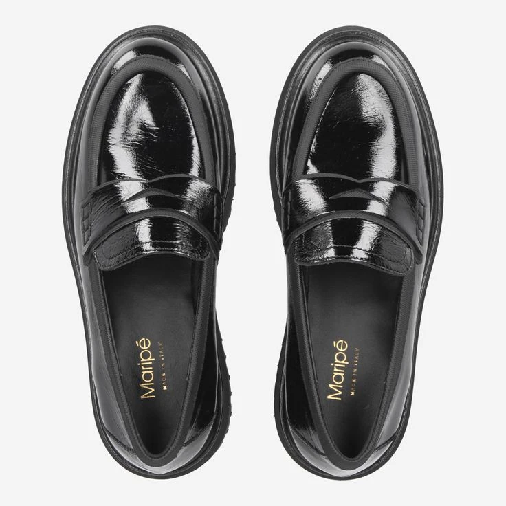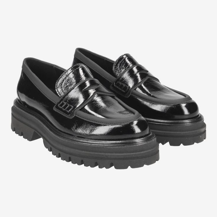 - Patent leather upper in crumpled patent look (flat, fine pleat structure guarantees optimal flexibility and prevents hard creases), block heel, platform sole 30 mm, loafer application, cut-out, breathable