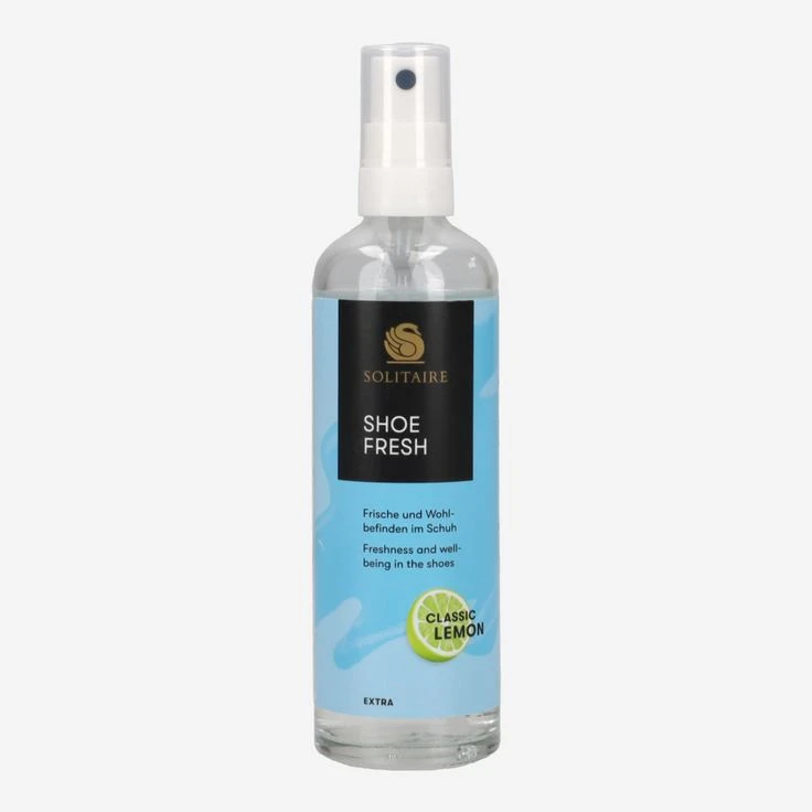 Shoe Fresh Deo from Solitaire. Disinfects and deodorizes. Shoe Fresh Deo eliminates bacteria and prevents odor. Simply spray in the evening and leave overnight. Content: 100 ml. the smell is Classic Lemon.