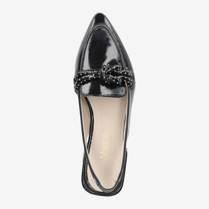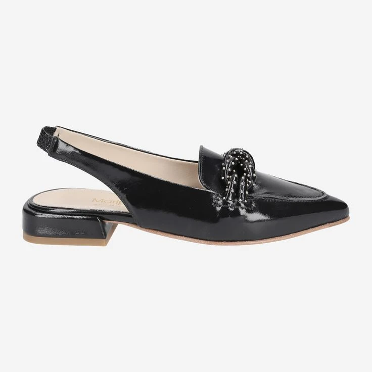 Elegant. Seductive. Stylish. Extravagant. If you like to play with these attributes, then Maripé has just the right model for you: SILVIA. This new sling pump impresses with deep black patent leather, feminine design and noble details. The loafer typical application in loop form is refined by numerous, silver-colored micro rivets. The narrow heel strap offers you a comfortable hold thanks to a stretch area. And by the way, your chocolate side is skillfully put in the limelight! Use them wherever you want to playfully convince with style and expression!