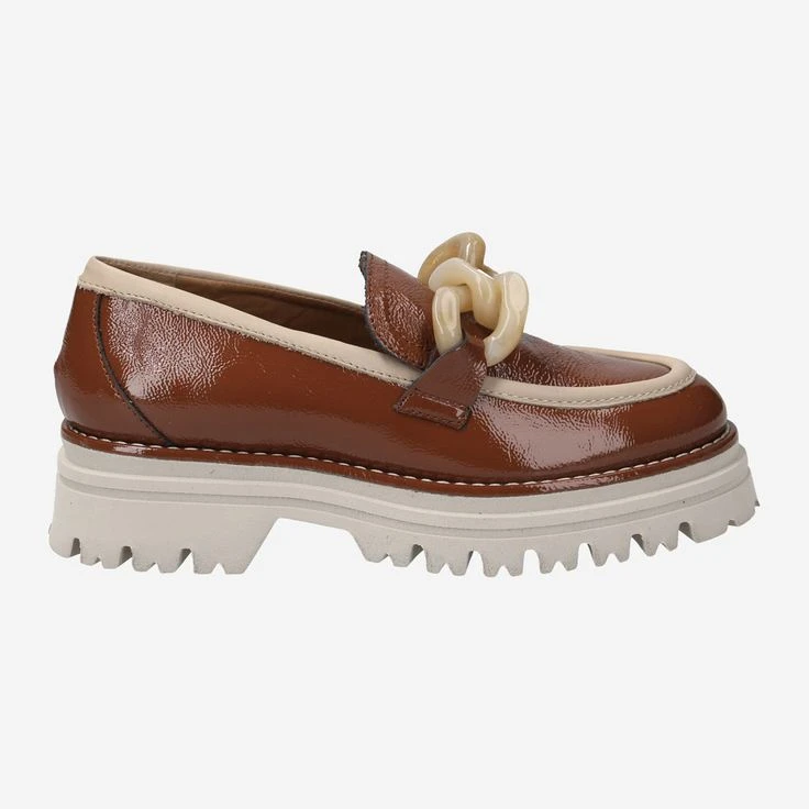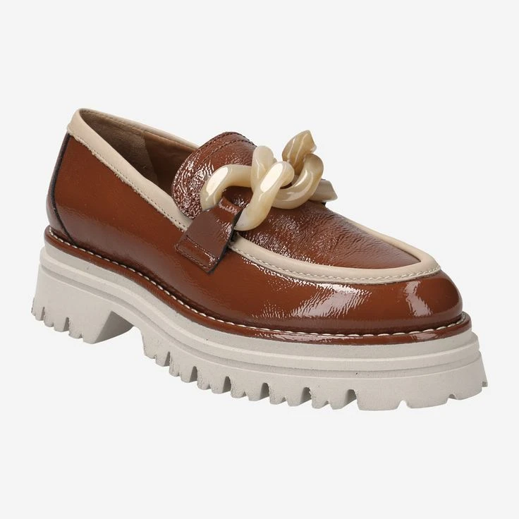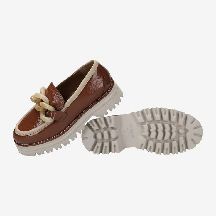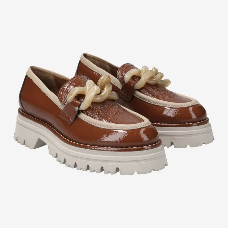 Our eye loves contrasts! Maripé combines the red-brown patent leather with light elements and a cream-colored platform sole. Now all you need is your favorite outfit to go with it – and your modern business look is ready! This penny loafer additionally scores with the oversized application of chain elements. This is an absolute must-have this season!