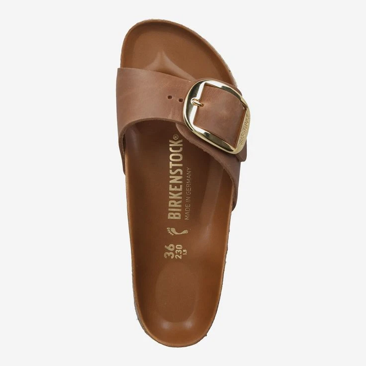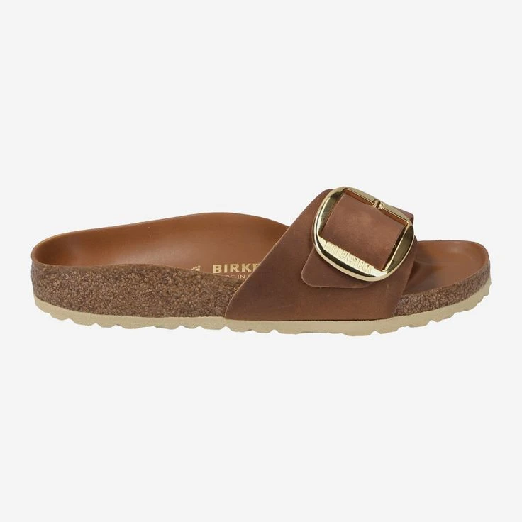 - Cork footbed, gold-colored, large metal buckle with logo embossing, logo embossing on the side, narrow width