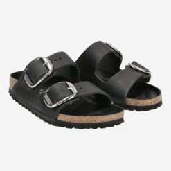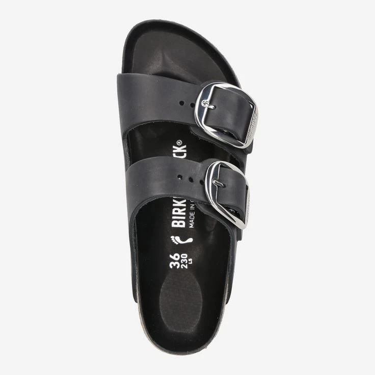 Look forward to this cult sandal from Birkenstock! The upper material of the model “Arizona Big Buckle” is made of black, especially thick, oiled nubuck leather. The two, silver-colored thorn buckles serve as a glamorous highlight, which serve as an optimal eye-catcher due to their size! With this mule Birkenstock shows exemplary that it also defines unique trends in this century!