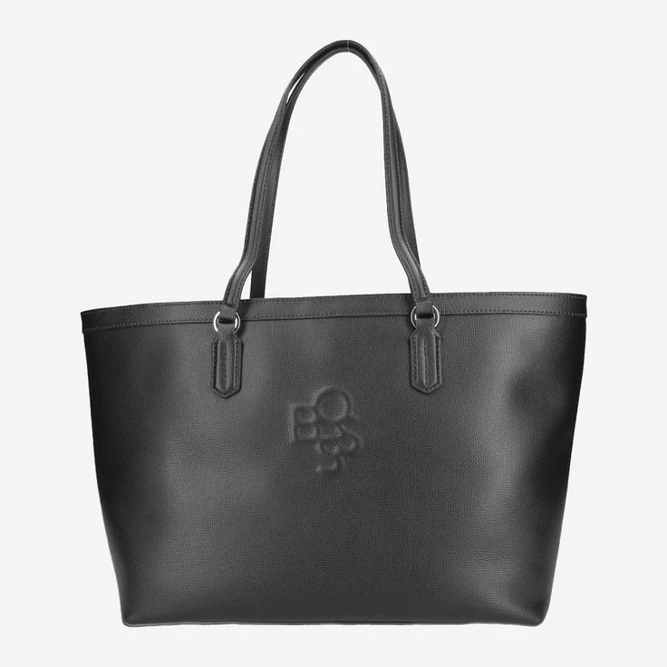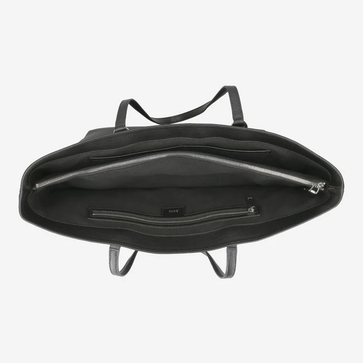 - Logo embossing, two leather carrying handles (24 cm), polished silver-tone metal hardware, plain polyester lining, spacious main compartment fits A4 documents, divider with zippered pocket, one zippered pocket, two slip pockets. H. 29 cm x W. 38 cm x D. 18 cm
