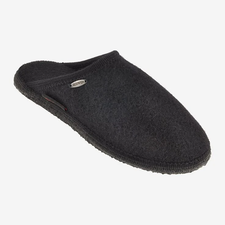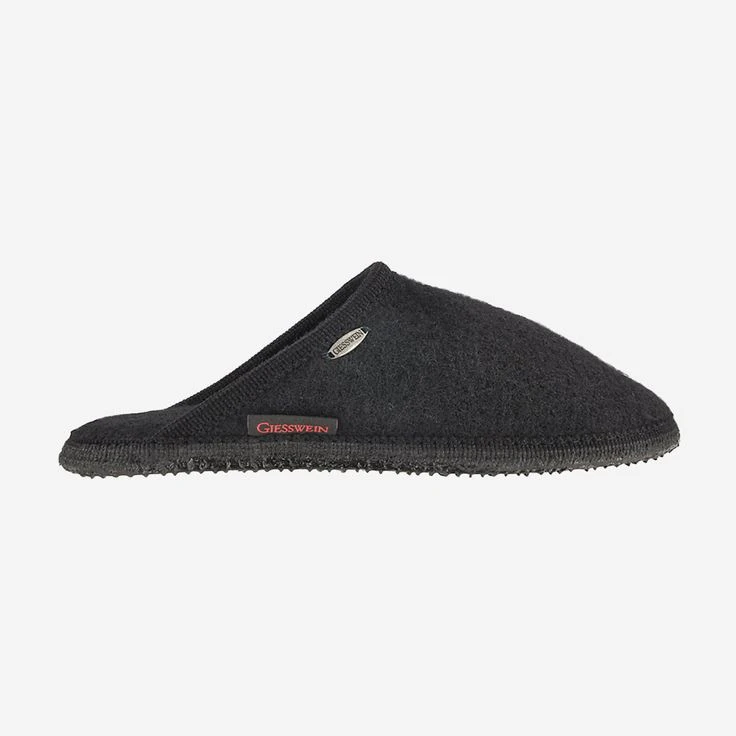 Black slippers from Giesswein. The upper material is made of 100% virgin wool. The inner lining and the cover sole are also made of virgin wool. A non-slip natural rubber sole ensures a good wearing comfort. Washable at 30 degrees, without fabric softener and dryer. Suitable for exchangeable footbed.