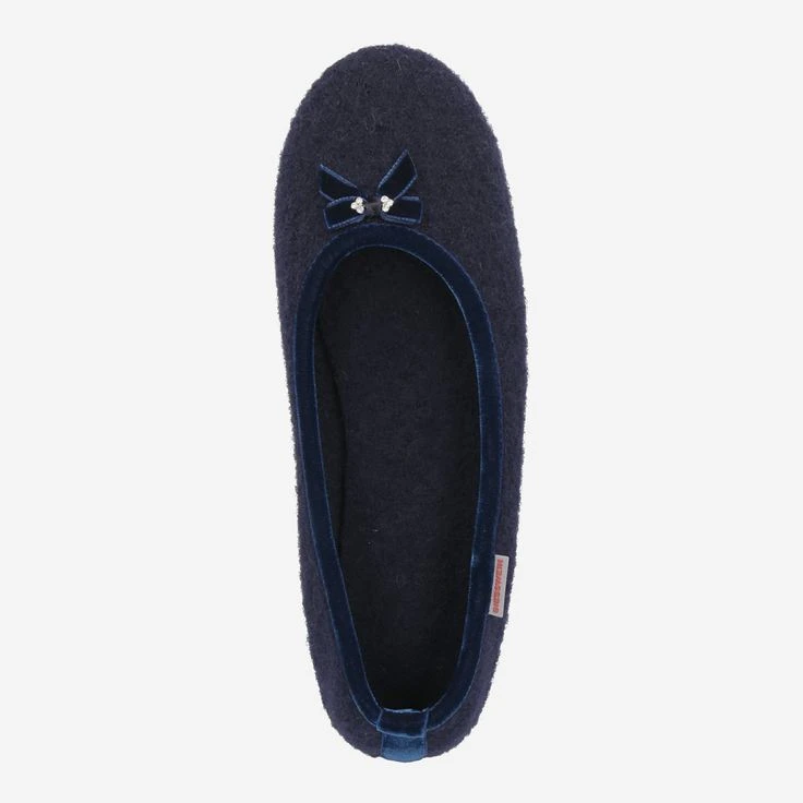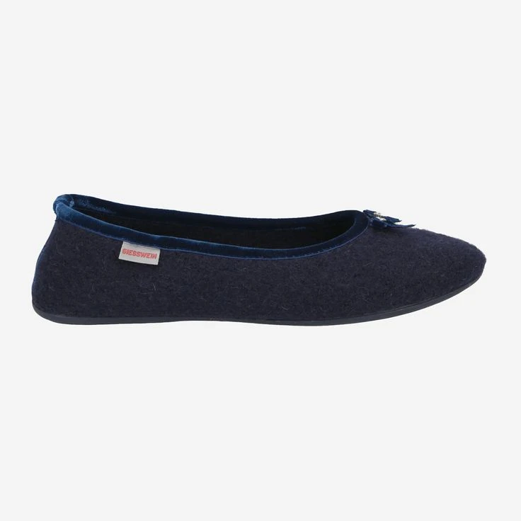 With this blue slipper you will enjoy the comfort of pure wool and the shapely design of a ballerina. The rolled wool warms your foot ideally, is breathable and as a pure natural material always a good choice. The model “Hohenau” by Giesswein is complemented by a non-slip, stable sole made of rubber, so that you step safely. The hem of dark blue velvet is decorated by a small bow with rhinestones.