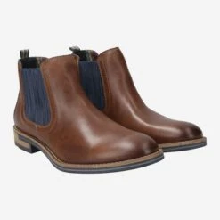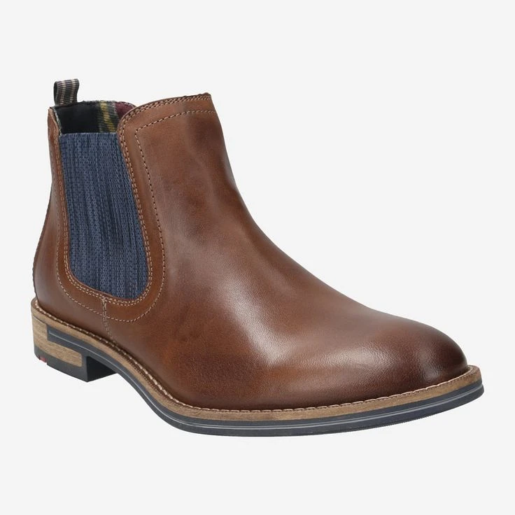 With “Dario” by LLOYD you enjoy dreamlike comfort, outstanding quality and a noble design. The cognac-brown calfskin can be combined in many ways, and cuts a great figure both with a business look and with jeans. The stretch inserts are on the one hand practical and comfortable, and on the other hand they set a skillful, colorful accent in blue. This is repeated in the non-slip rubber sole, and makes this Chelsea boot a real eye-catcher!