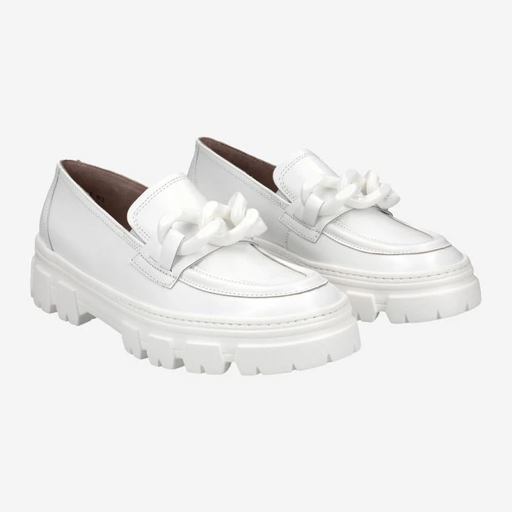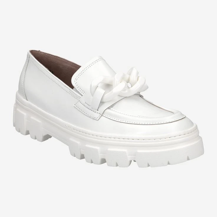 Fashionistas love these SUPER SOFT loafers from Paul Green. Made of soft smooth leather in white, this popular trendsetter has a sporty and pithy look that will suit any wardrobe. The bulky synthetic chain has been tonally matched to the leather for a simply casual look. The matching progressive outsole makes walking a pure pleasure. A casual loafer with a cool shell and a soft core! Paul Green makes shoes with great passion and mastery, expressed in perfection, quality, style and fit. The result: a unique, uplifting wearing experience! The Paul Green effect.