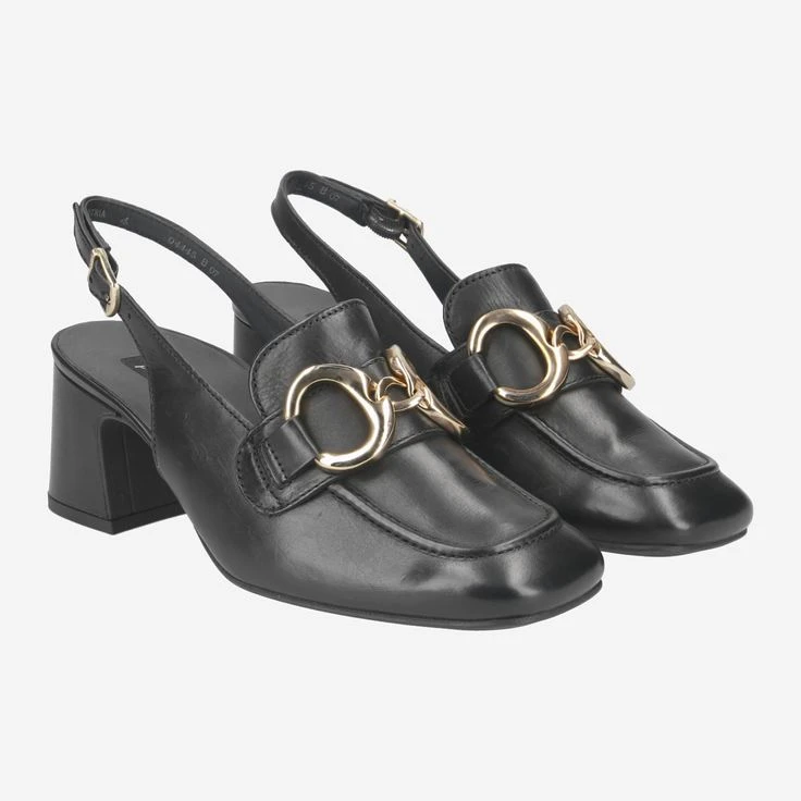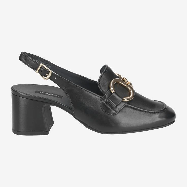 - Metal closure, block heel, loafer application, metal application, decorative seams, stretch insert, breathable