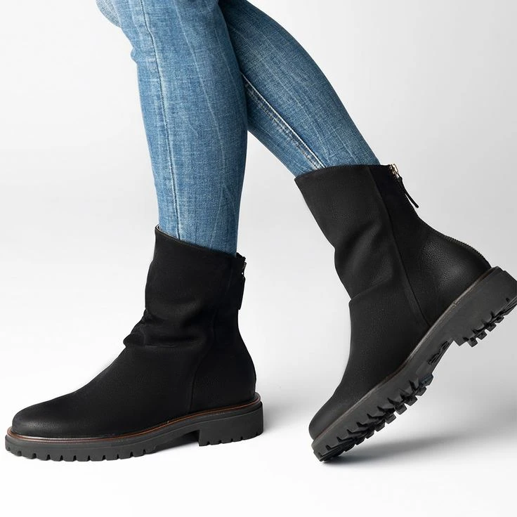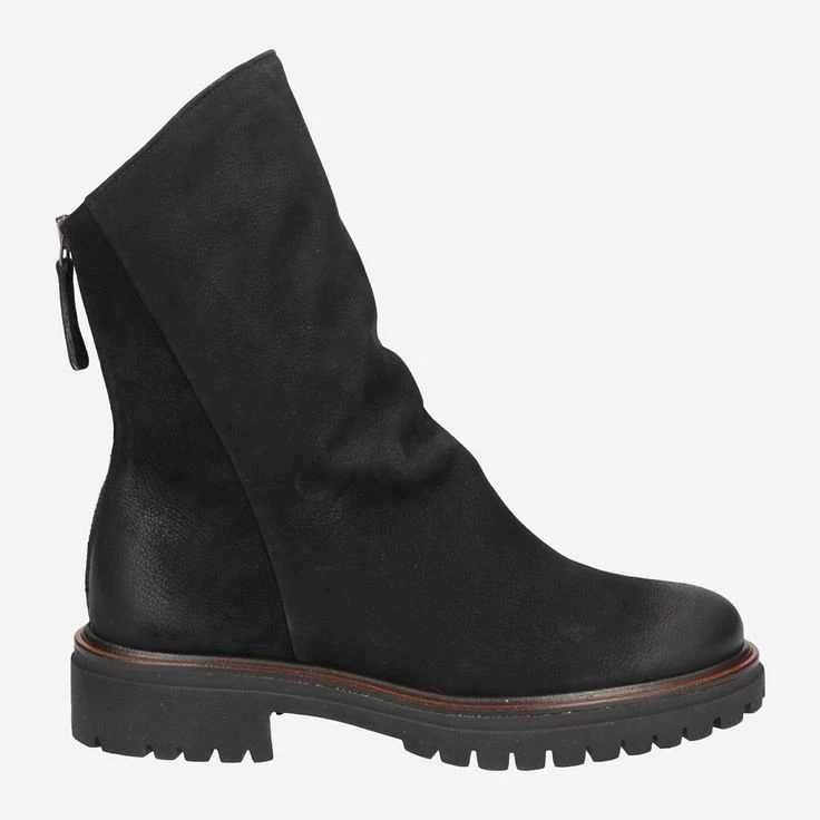 - Zipper in heel area, asymmetrical shaft(higher in front than in back), block heel, leather application at zipper, breathable
