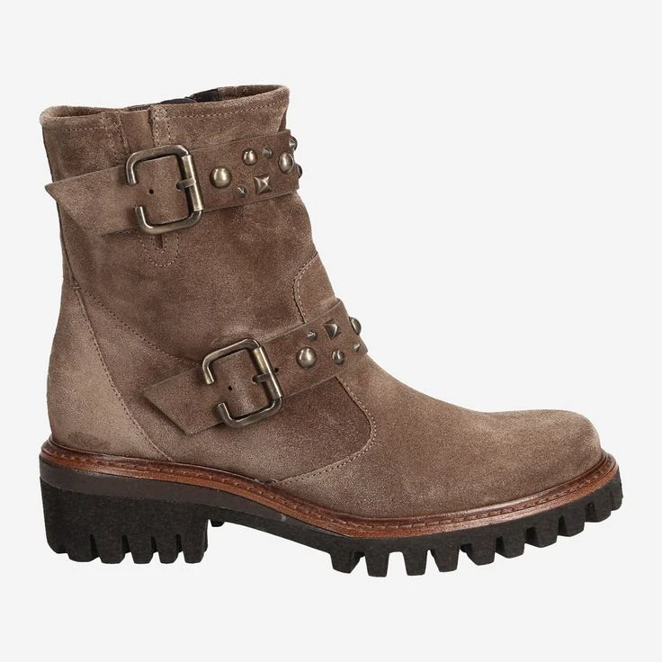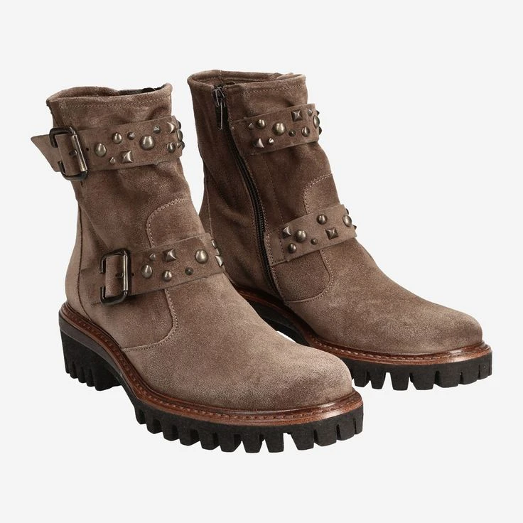 These wonderful biker boots made of brown suede from Paul Green inspire not only by the two metal buckles, but also by the stud applications that decorate the front of the shoe. The warm, autumnal hue invites you to take an extended walk in the woods and the pronounced tread sole gives the shoe a secure grip even in wet weather. The zipper makes it easy to put on and take off.