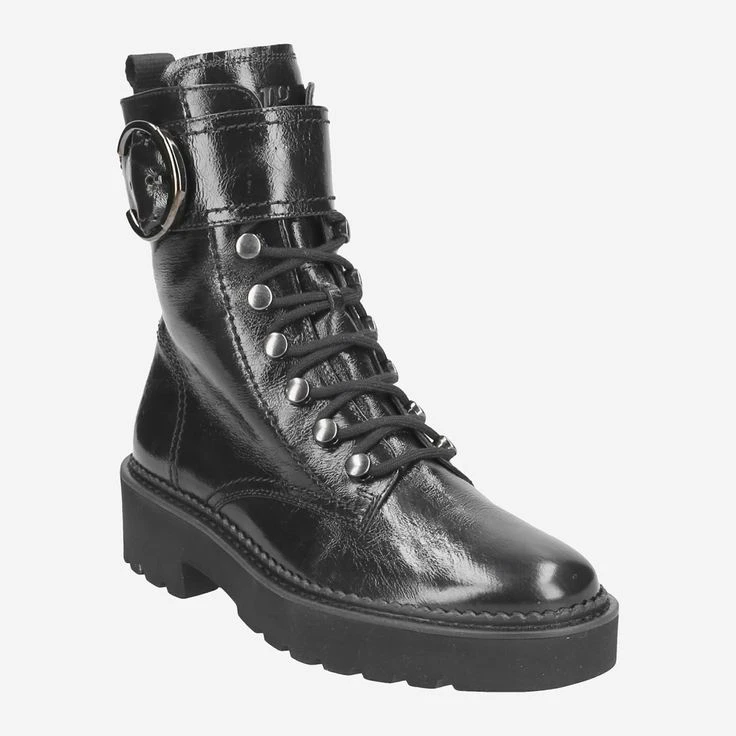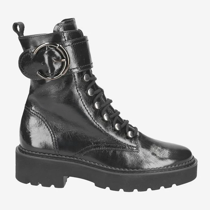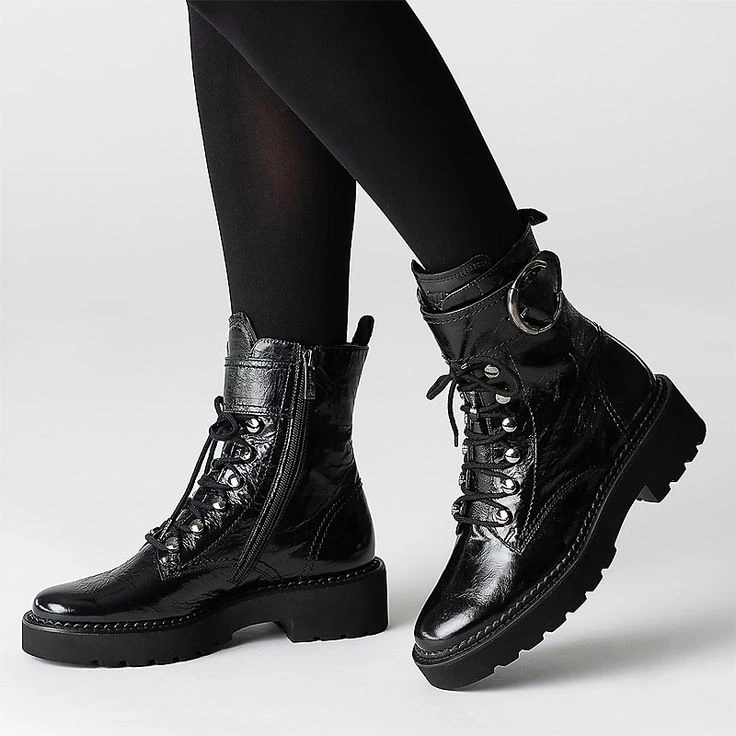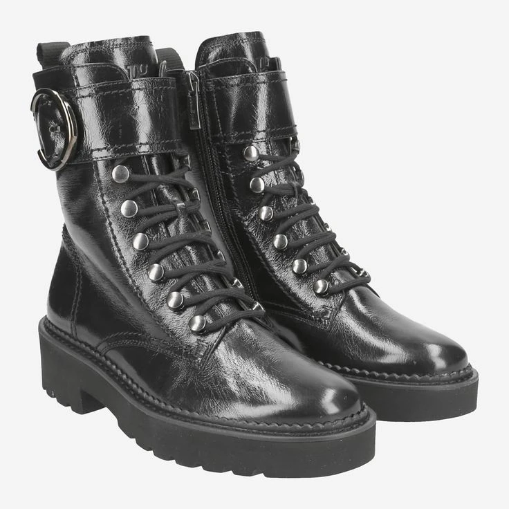 - Zipper closure, decorative closure with metal buckle, eyelet applications, logo embossing, entry loop, block heel, sole height at front: 25 mm, flexible, adaptable crumpled varnish