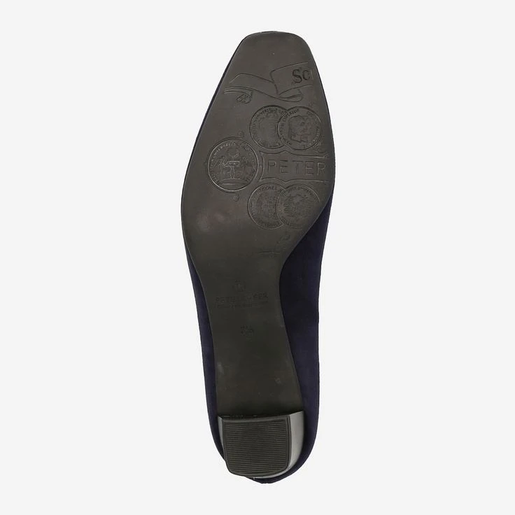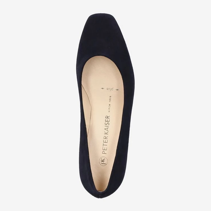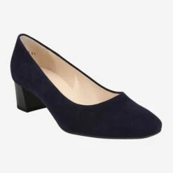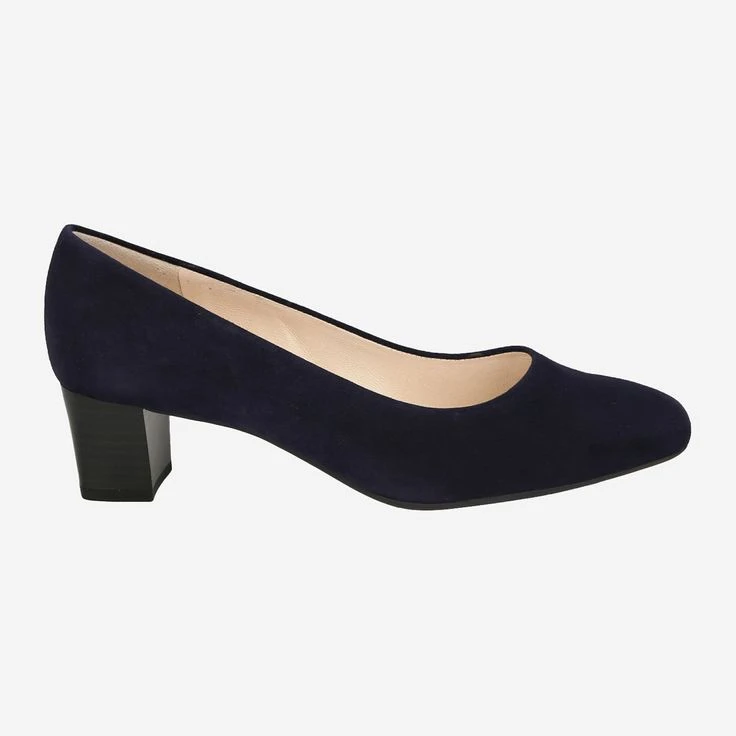 Timeless pump made of blue suede. The leather interior and the extra wide shape guarantee maximum comfort. The 50 mm high block heel and the rubber sole provide a stable hold and a safe walking comfort.