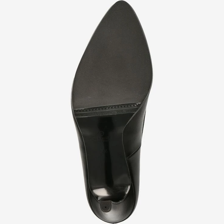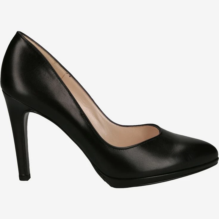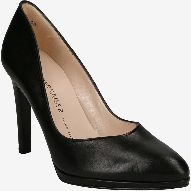 Black ladies pumps from Peter Kaiser. The upper is made of smooth leather, the lining is lined with leather. The pumps have a leather insole and a rubber sole. The heel is about 95mm high, the platform about 10mm, both are covered with leather.