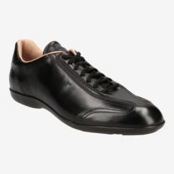 An elegant appearance is assured with this calfskin sneaker from the house of Santoni. The model with hand-applied fine antique finish in bold black and the narrow tapered shape is sure to become your new favorite shoe. The outsole is made of high quality rubber and the lining is made of soft leather.