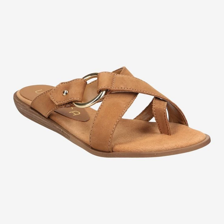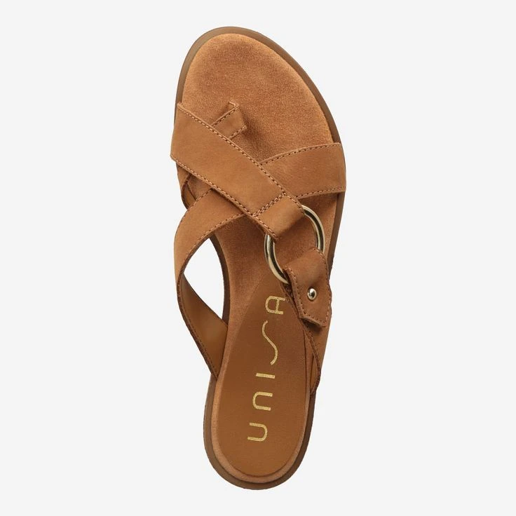 Treat yourself to this Spanish luxury sandal from Unisa! The model “Adriel” inspires by the pleasantly flat shape, and the cognac brown suede straps. A gold-colored metal ring serves here as a refined, noble eye-catcher!