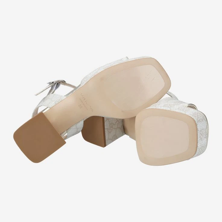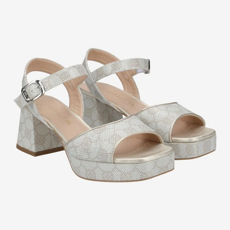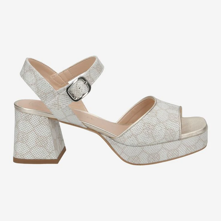 - Metal closure, platform sole, block heel, stretch insert, logo embossing, glitter in textile with graphic pattern, breathable,glam rock look.